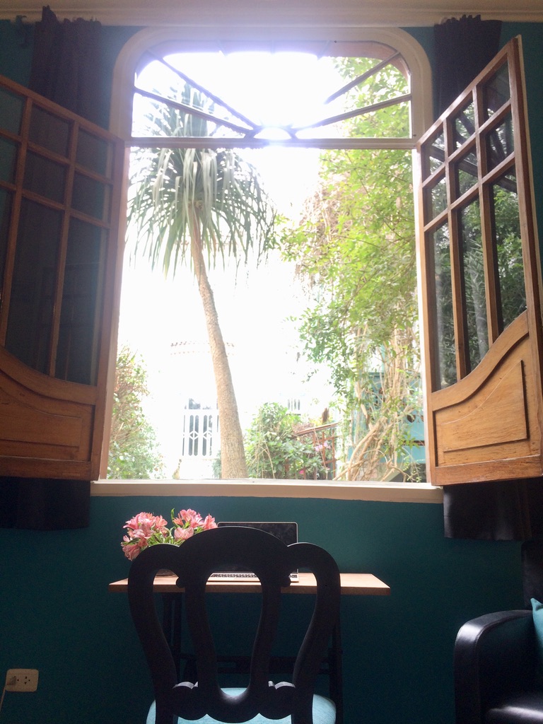 - This is a very inspirational room in the garden house of the Monumental Mansion. We have recently renovated this room, new colors, fridge in the hall and carpet on the floor. In this room we have provided house shoes / slippers as normal shoes are not allowed inside for hygienic reasons. The bathroom with bathtub and water closet are in separate rooms in the hall and accessed by wooden stairs. You work inside the room on the desk and sit outside on the private terrace surrounded by plants and trees.